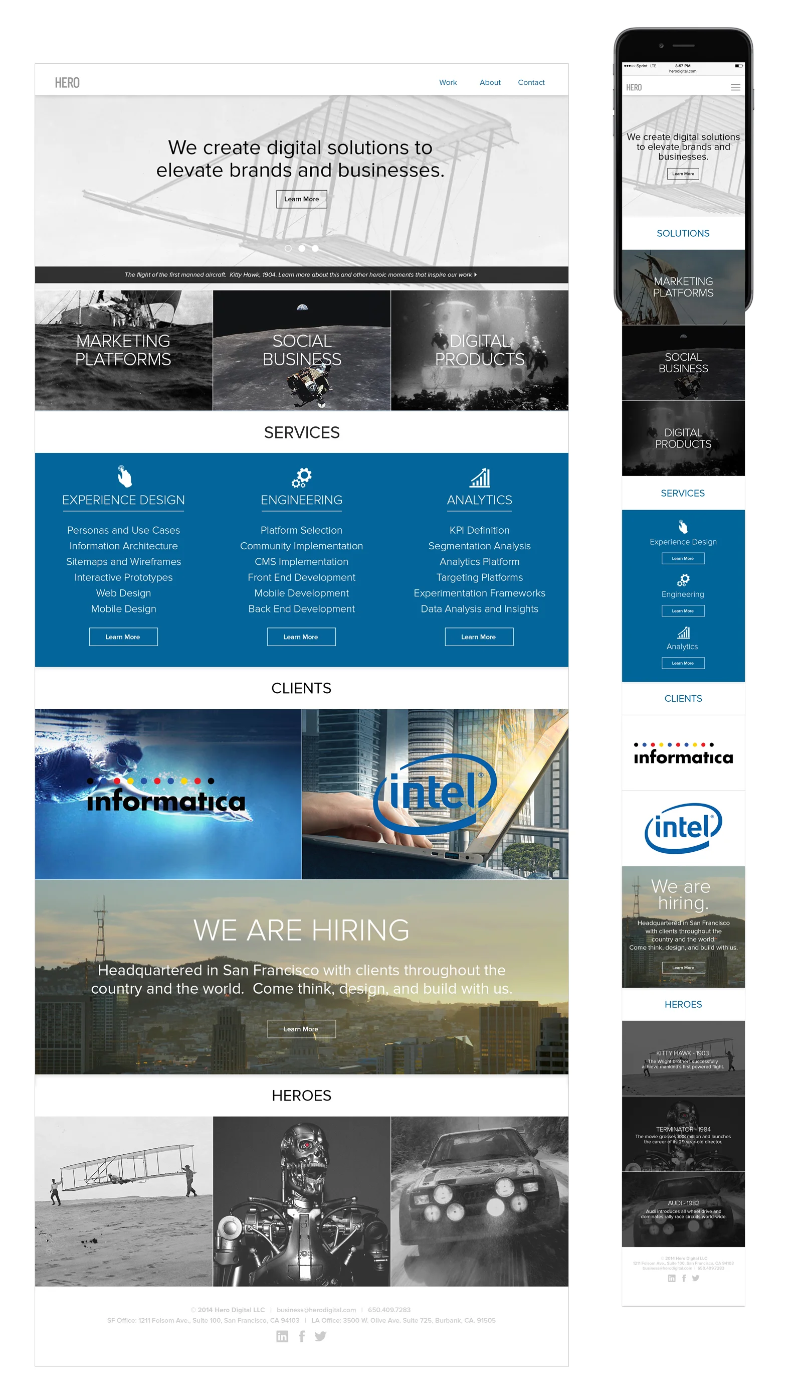 Hero Digital web and mobile site designed from concept to completion. As the only visual designer on the team, I worked closely with key stakeholders including CEO, President, and VP to design the brand including identity, website, mobile website and office interiors. You can see the identity work for Hero Digital here.