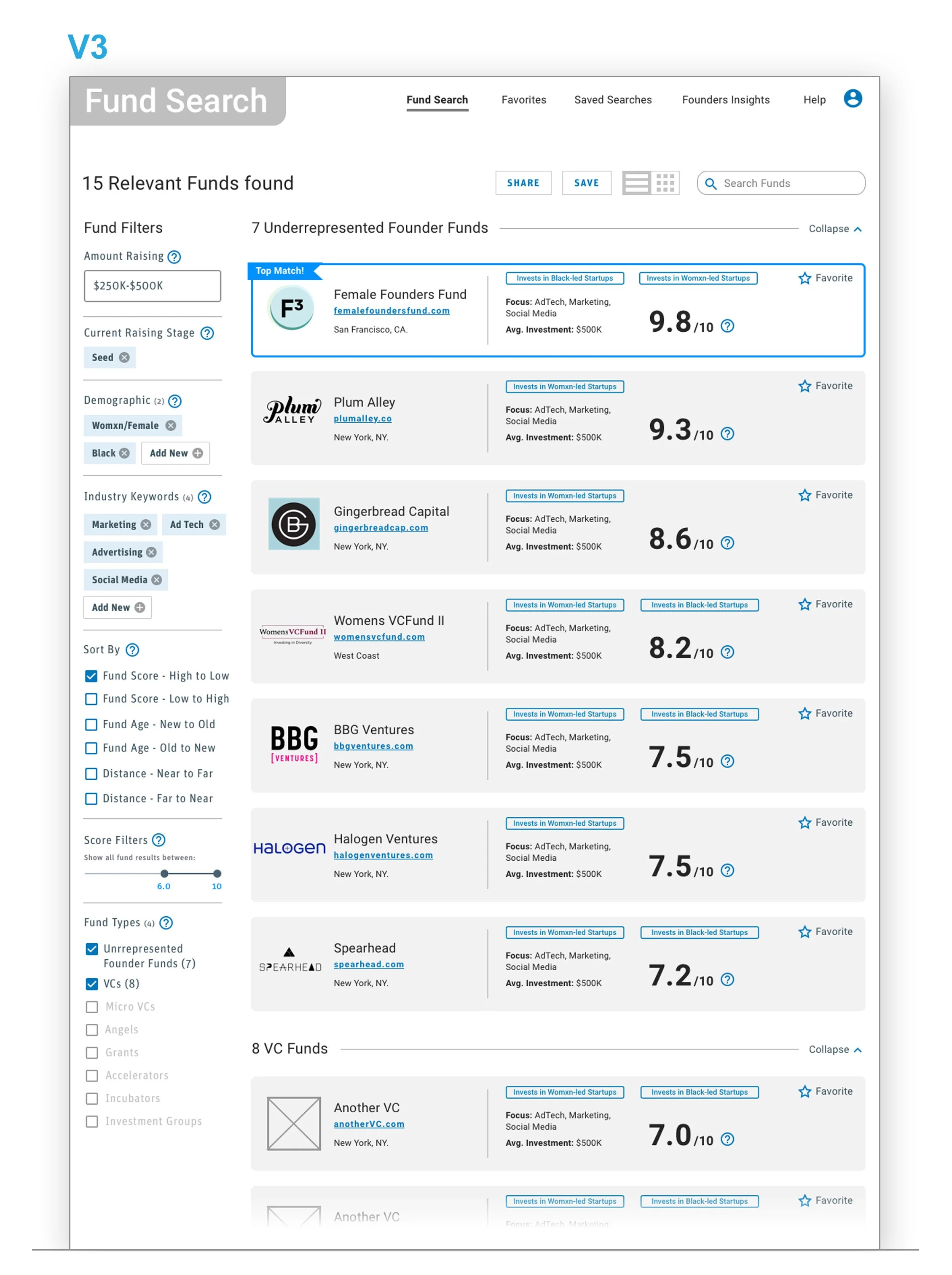 Leveraging a partner’s VC search/match API, we sought to validate impact and perceived value with a focus on amplifying underrepresented Womxn/BIPOC founders. I partnered with a UX researcher to develop an interview script, and adapted the features from the MVP above to create a lightweight mid fidelity prototype. Over the course of three weeks, after each round of founder interviews, we rapidly iterated on our prototypes each week. In the end, we uncovered incredibly powerful and moving insights regarding the vast challenges and headwinds these founders encounter to find investors, how they leverage their personal network across platforms to learn and gain investment leads, and how the language that is used across the innovation/banking economy creates or weakens trust in the establishments.